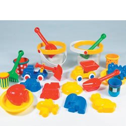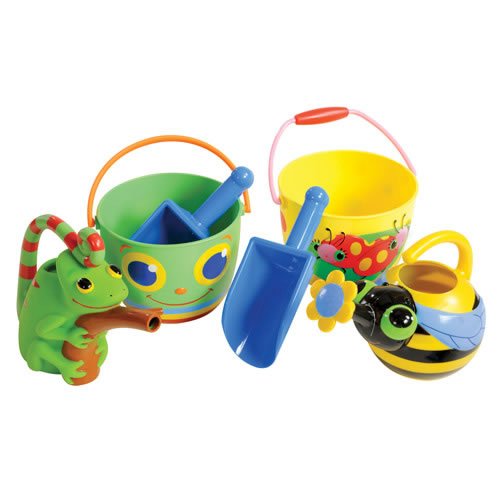 - Includes two watering cans (one with a pouring spout and one with sprinkling spout), 2 large durable buckets and 2 scoops (color may vary) for digging.